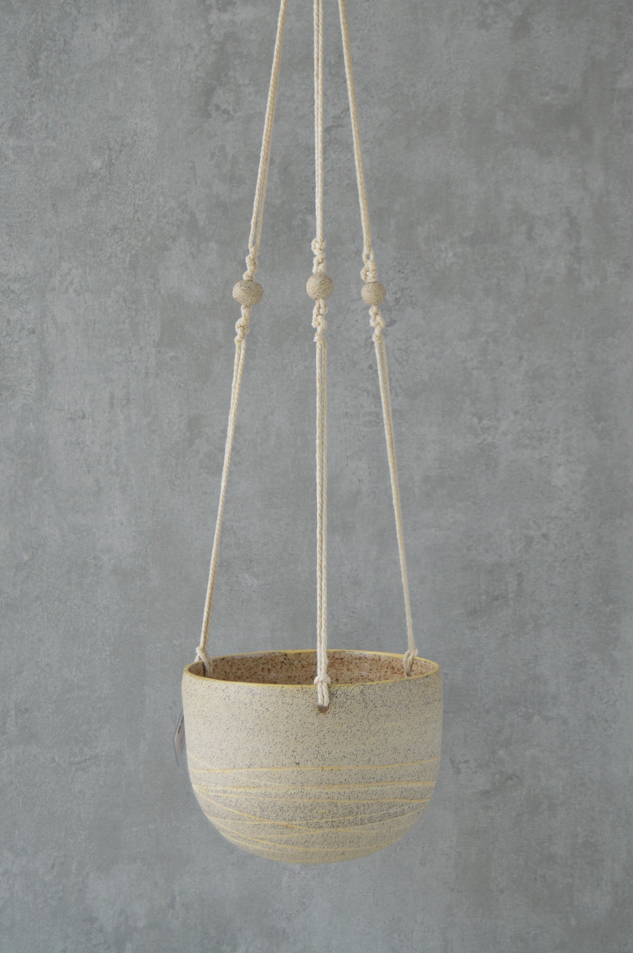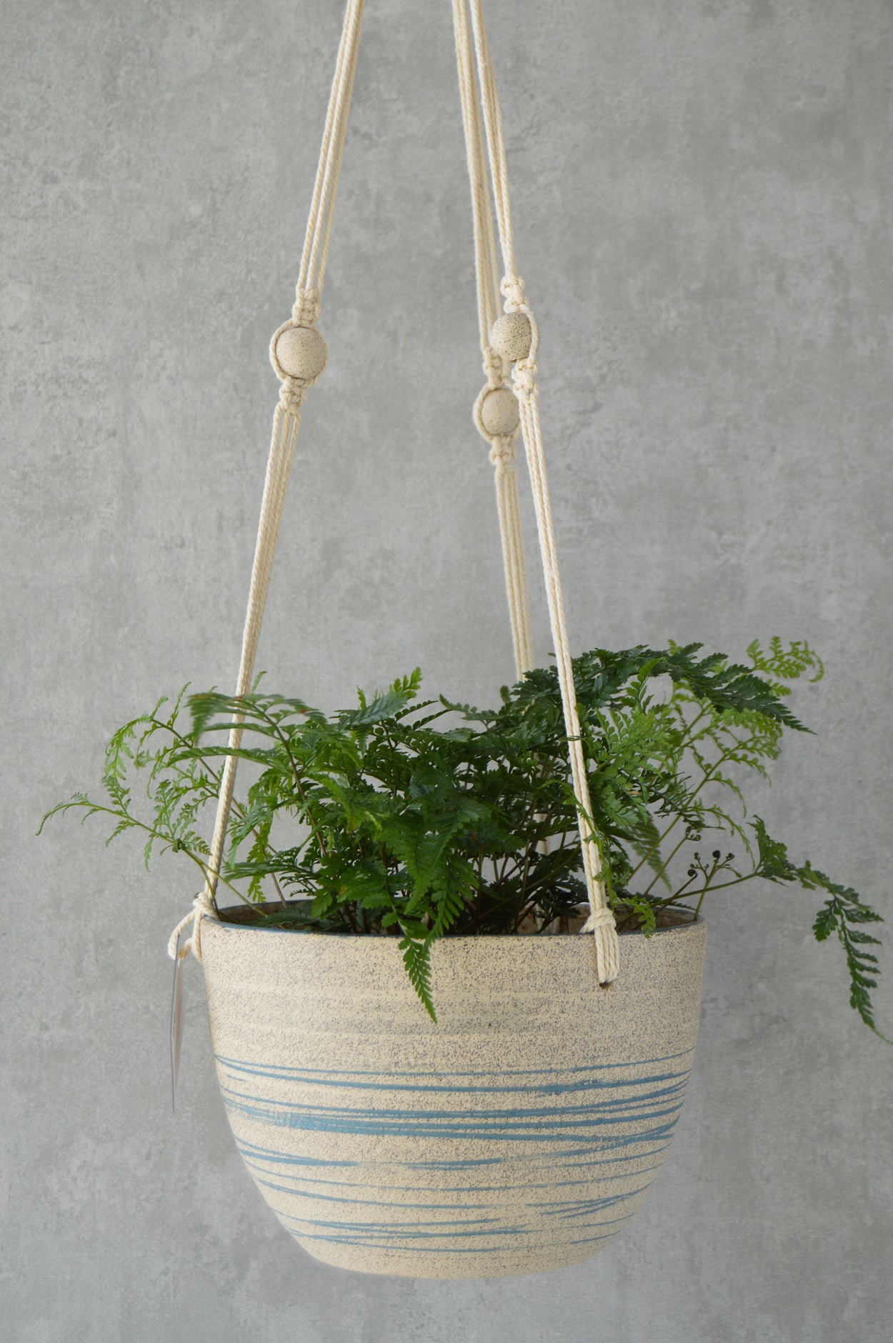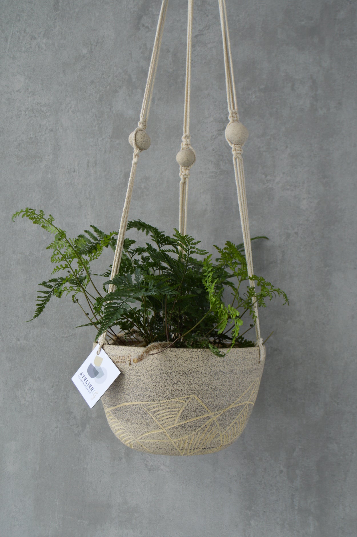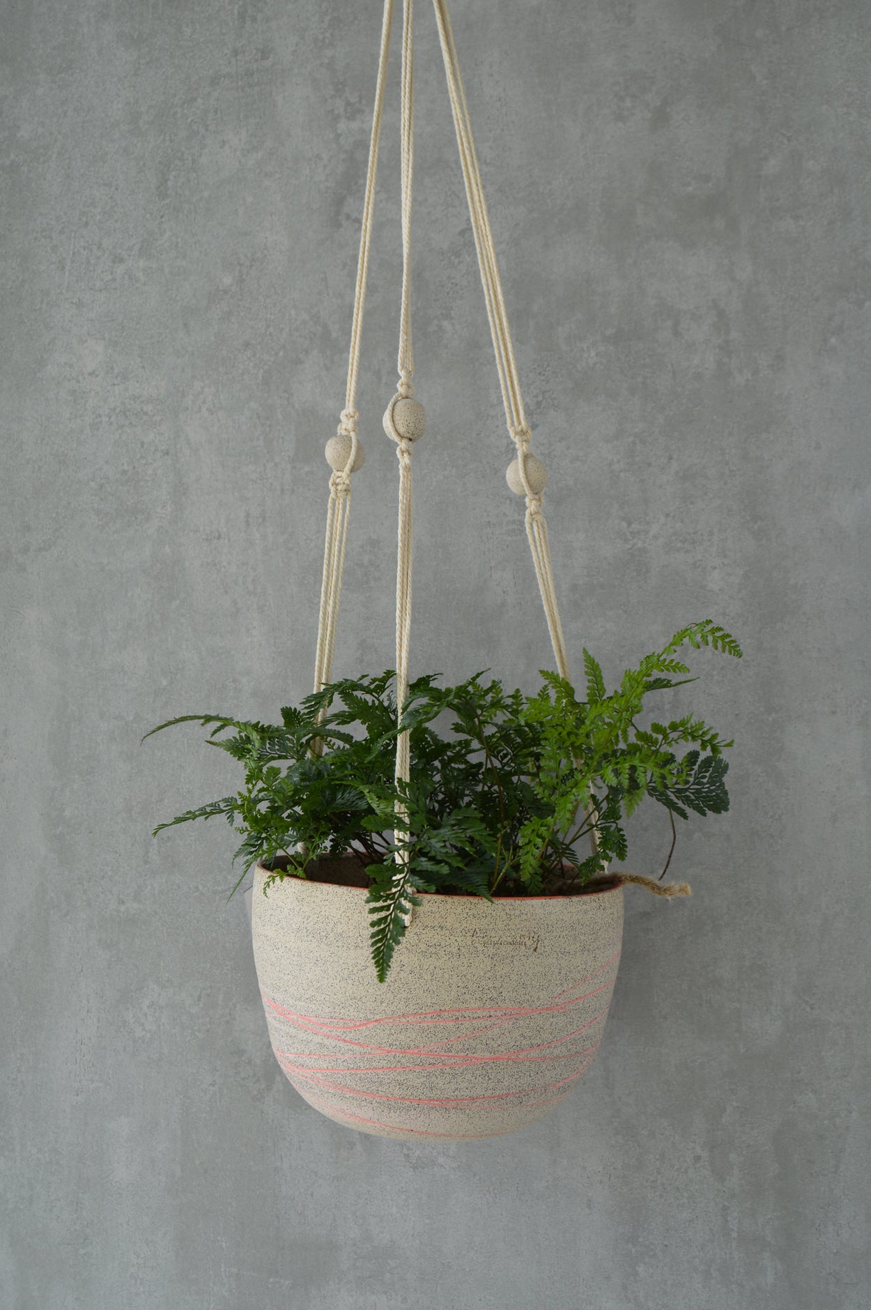 Jardinière en grès. Attache en macramé (coton biologique) et perles en céramique.