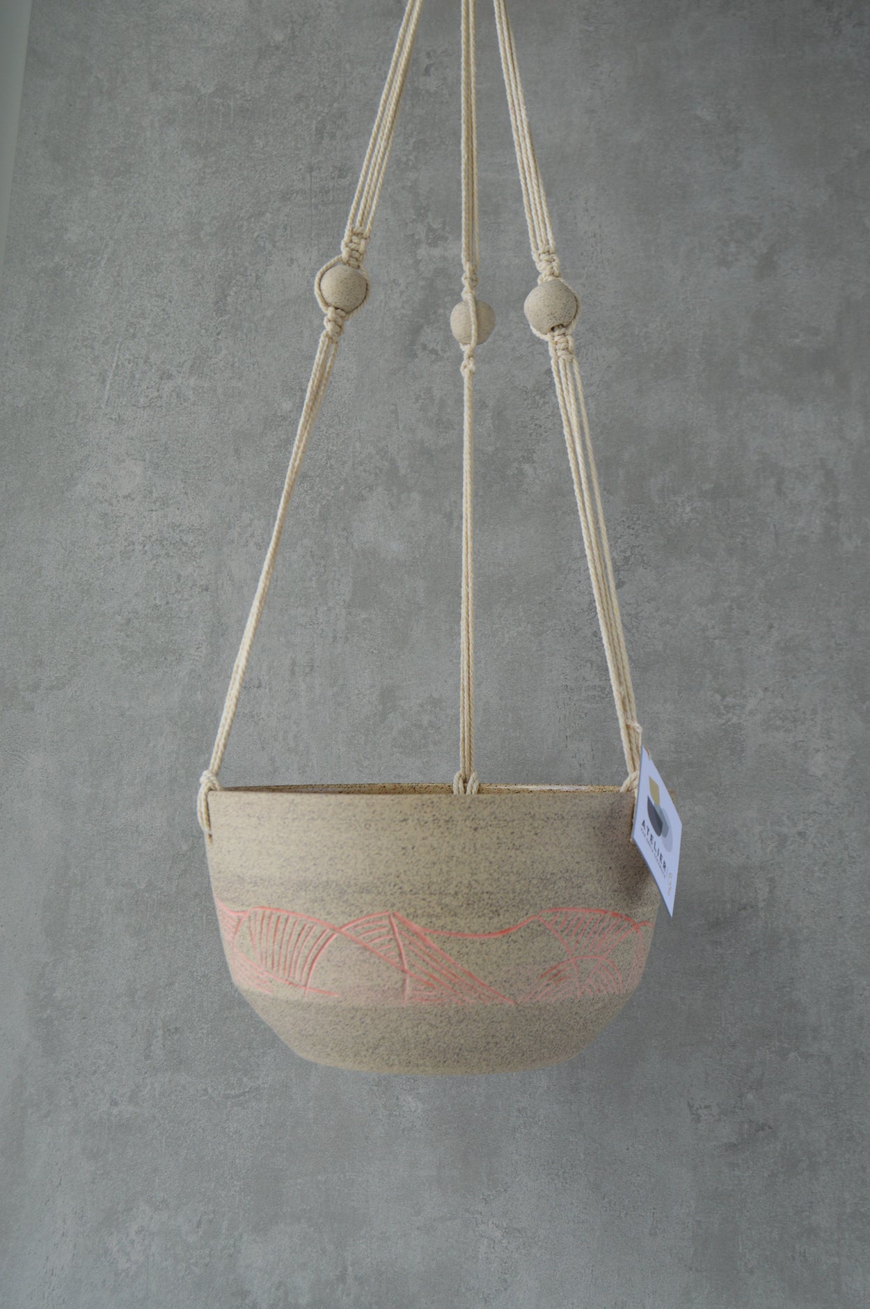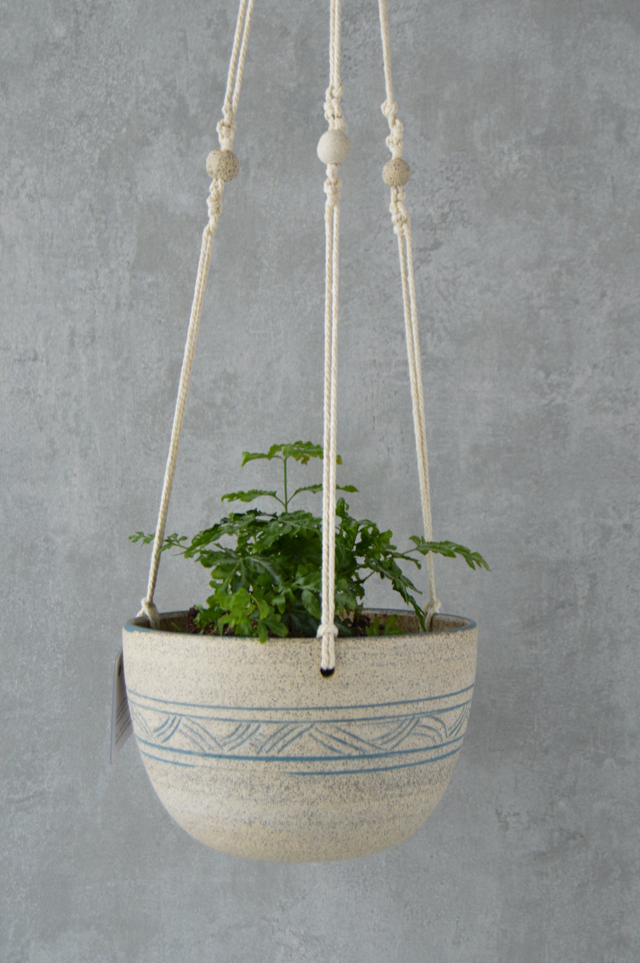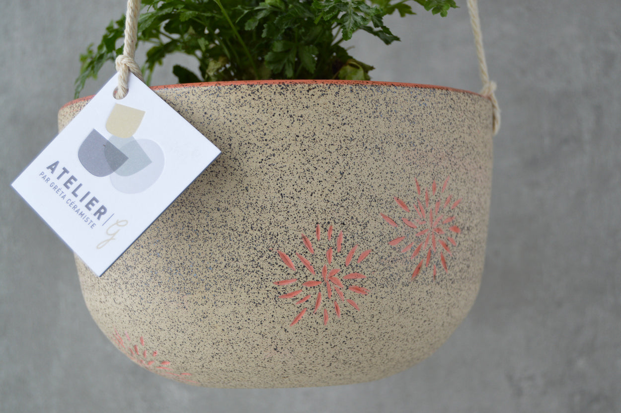 Jardinière en grès. Attache en macramé (coton biologique) et perles en céramique.