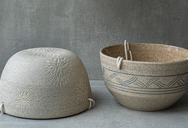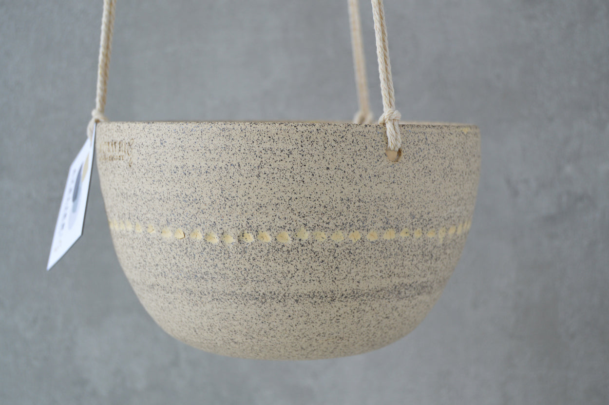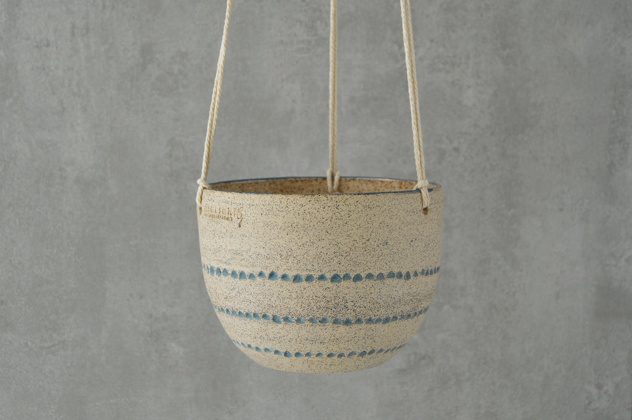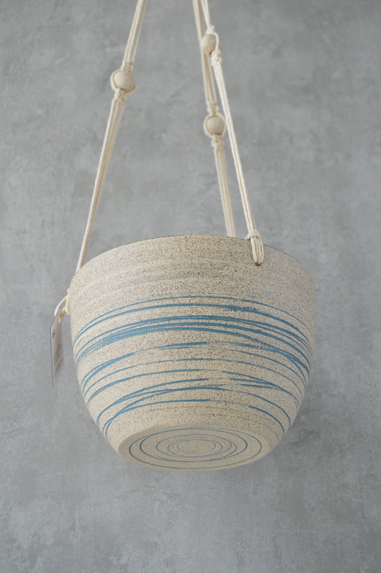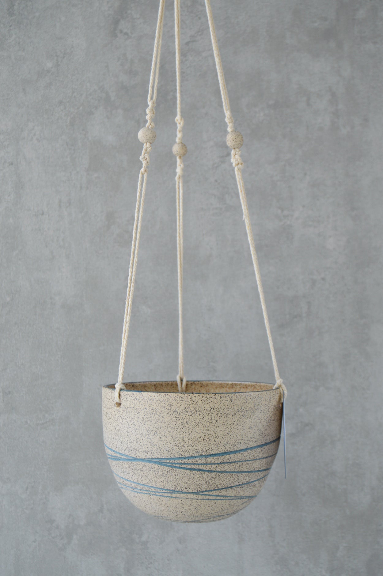 Jardinière en grès. Attache en macramé (coton biologique) et perles en céramique.