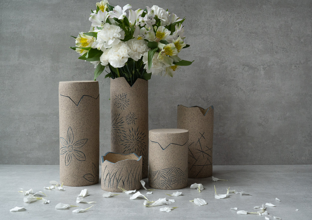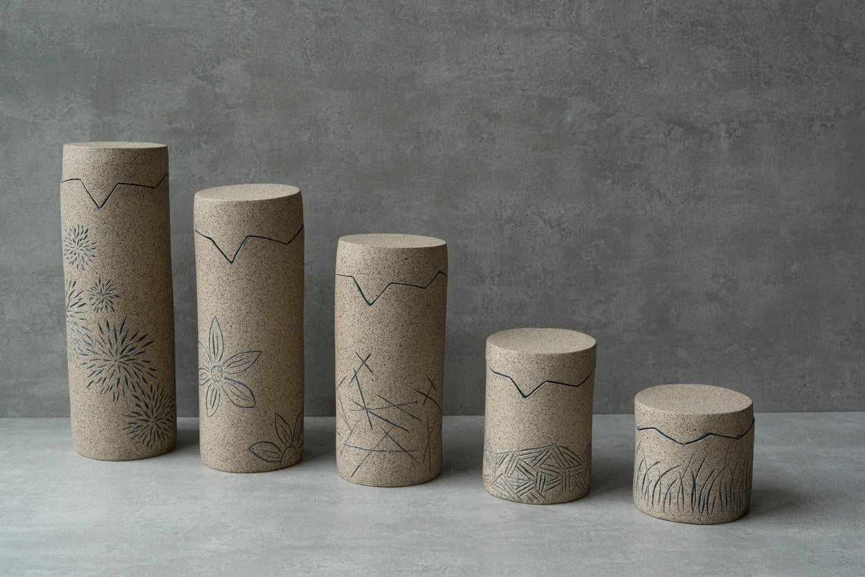Réalisés en grès pyrité comme toute la collection Louis XX, ces tubes avec couvercle sont complètement émaillés à l'intérieur. Le décor est différent sur chaque pièce. Ils peuvent servir pour stocker des produits alimentaires, servir de vases ou tout simplement être des objets décoratifs.
