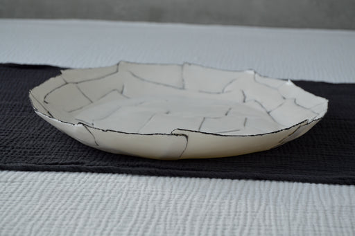 Chaque pièce est façonnée à la main, fruit d'un assemblage minutieux de languettes de porcelaine, qui lui confère sa forme et son caractère unique. La cuisson, parfois capricieuse, ajoute de légères variations. Les lignes blanches et noires se répondent, créant un équilibre subtil entre élégance et spontanéité, pour une vaisselle où l'utilitaire se fait poésie.