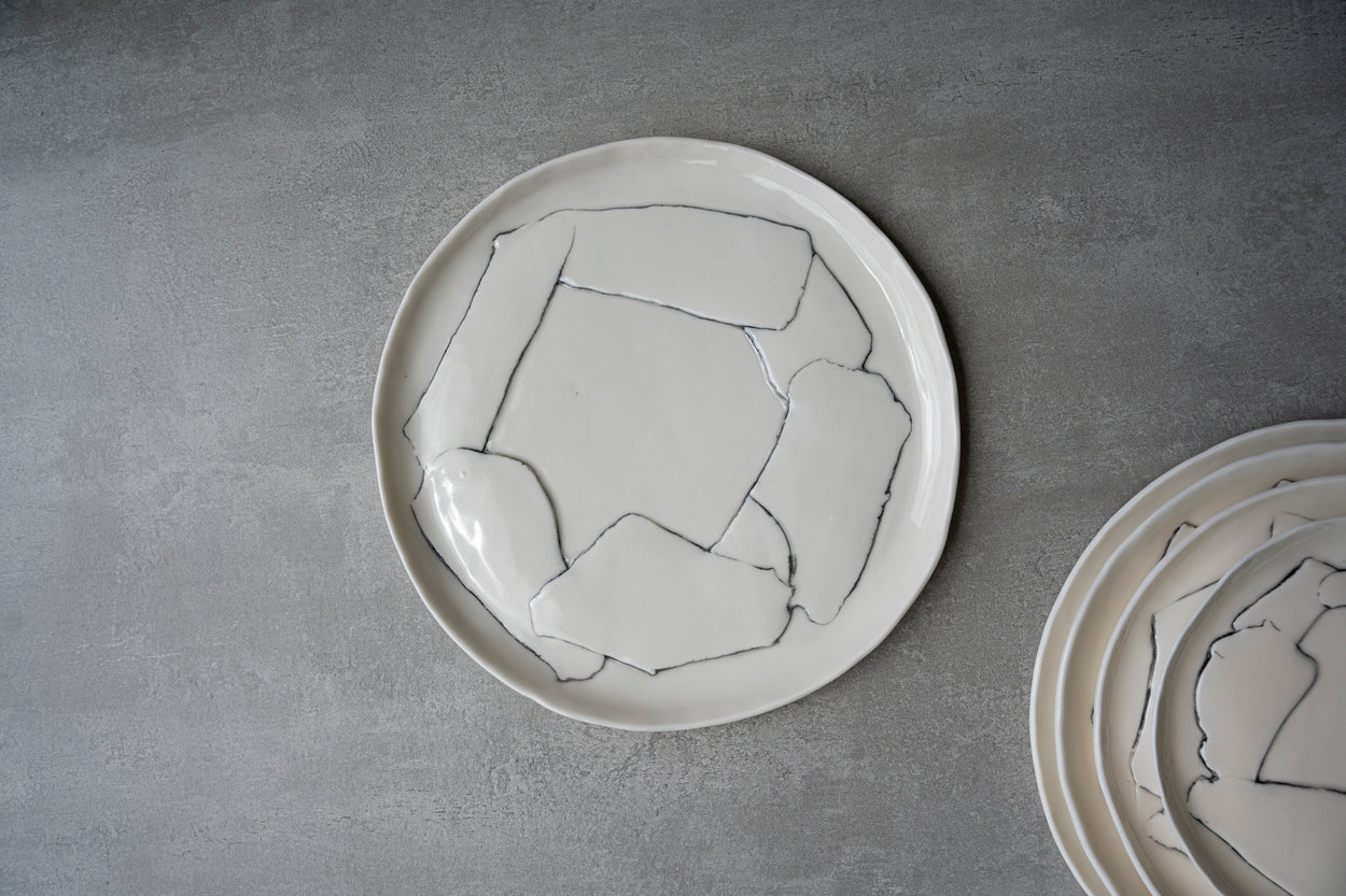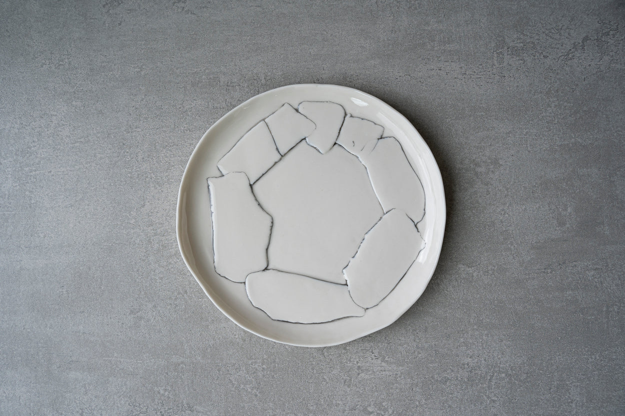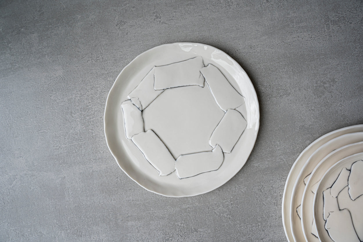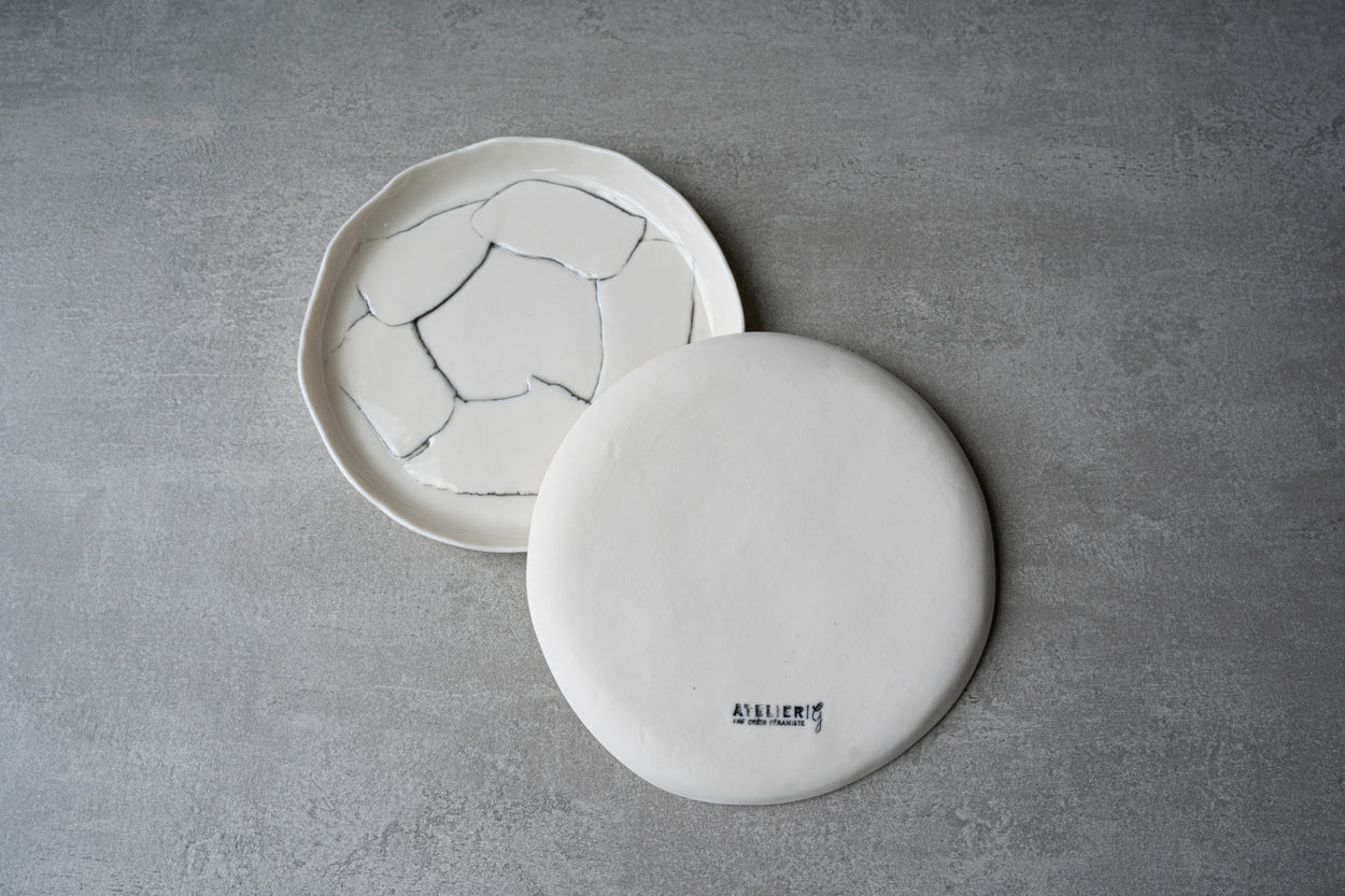 Assiette en porcelaine fine, blanche et translucide à la lumière. Emaillée à l'intérieur, polie à l'extérieur.