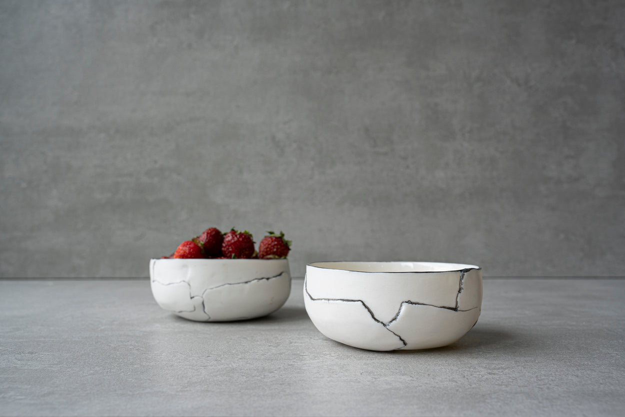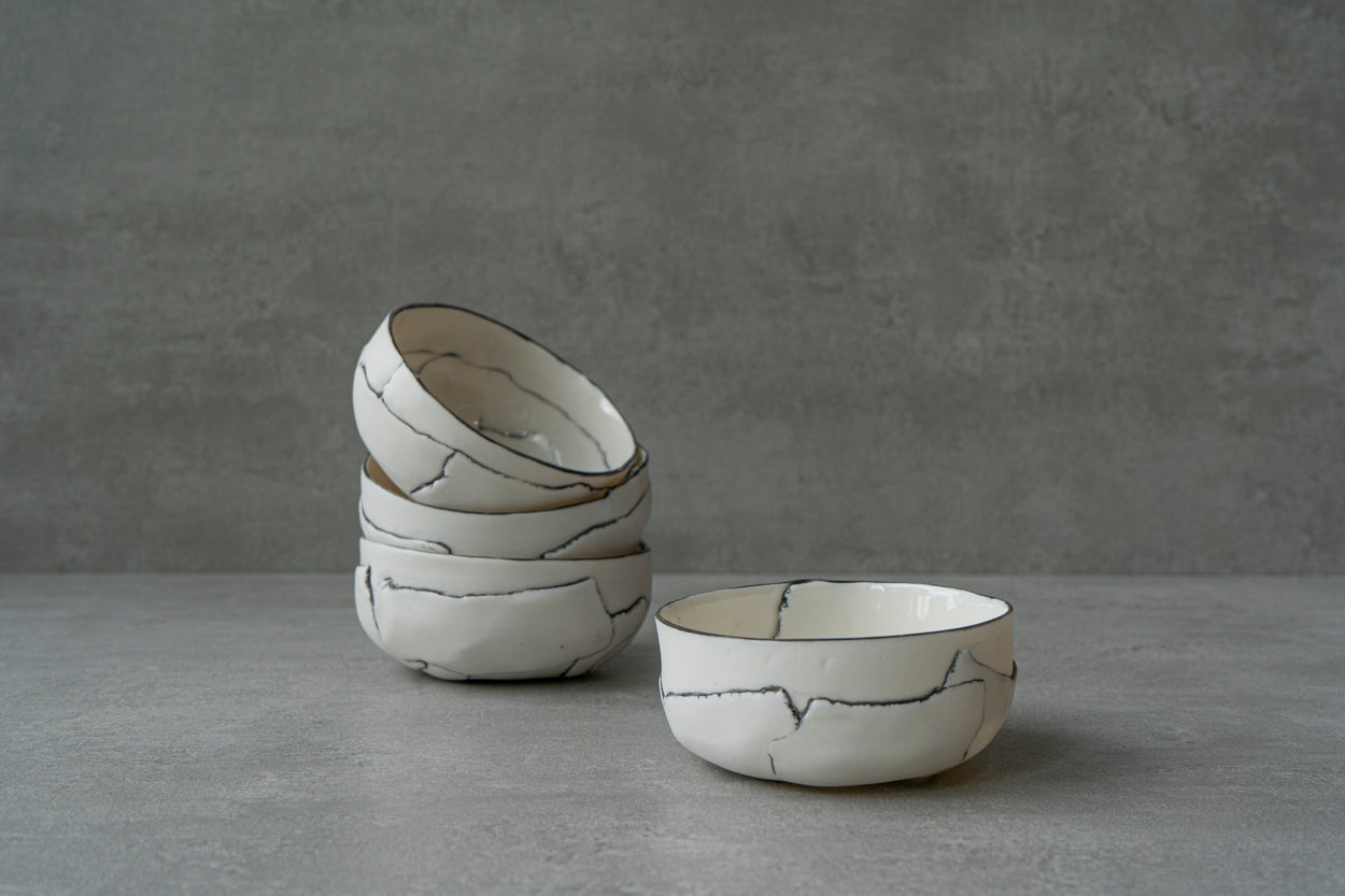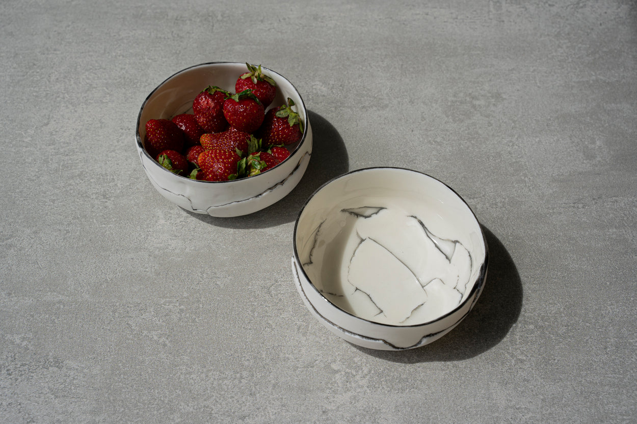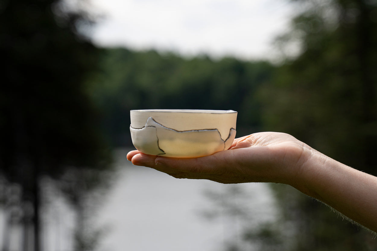 Bol à dessert en porcelaine fine, blanche et translucide à la lumière. Émaillé à l'intérieur, poli à l'extérieur.
