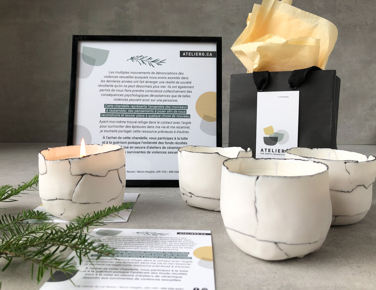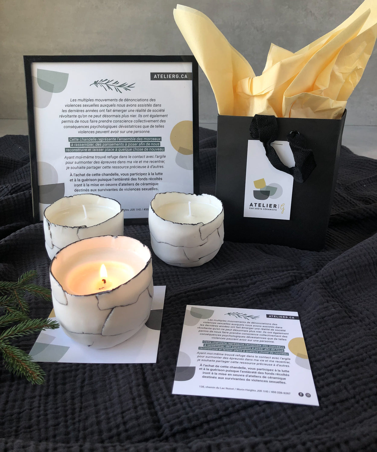 A l'achat de cette chandelle, vous participez à la lutte et à la guérison puisque l'entièreté des fonds réalise iront à la mise en œuvre d'ateliers de céramique destinés aux survivantes de violences sexuelles.