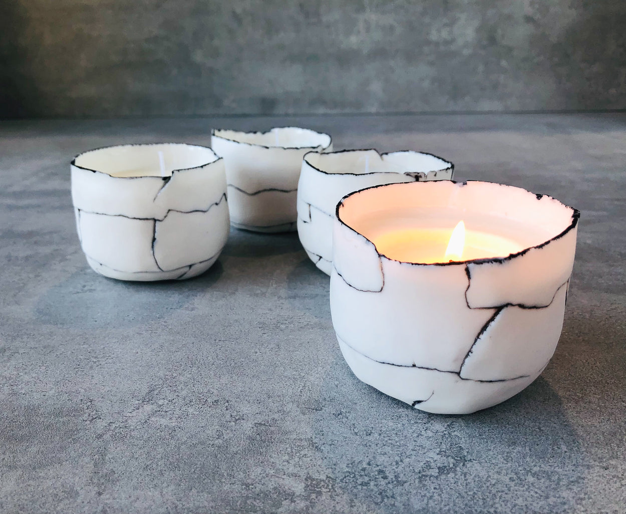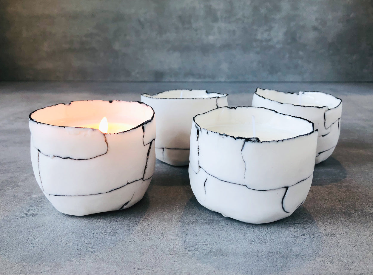 Chandelle de cire de soja dans un gobelet façonné à la main en porcelaine fine et translucide à la lumière. Chaque chandelle est unique.