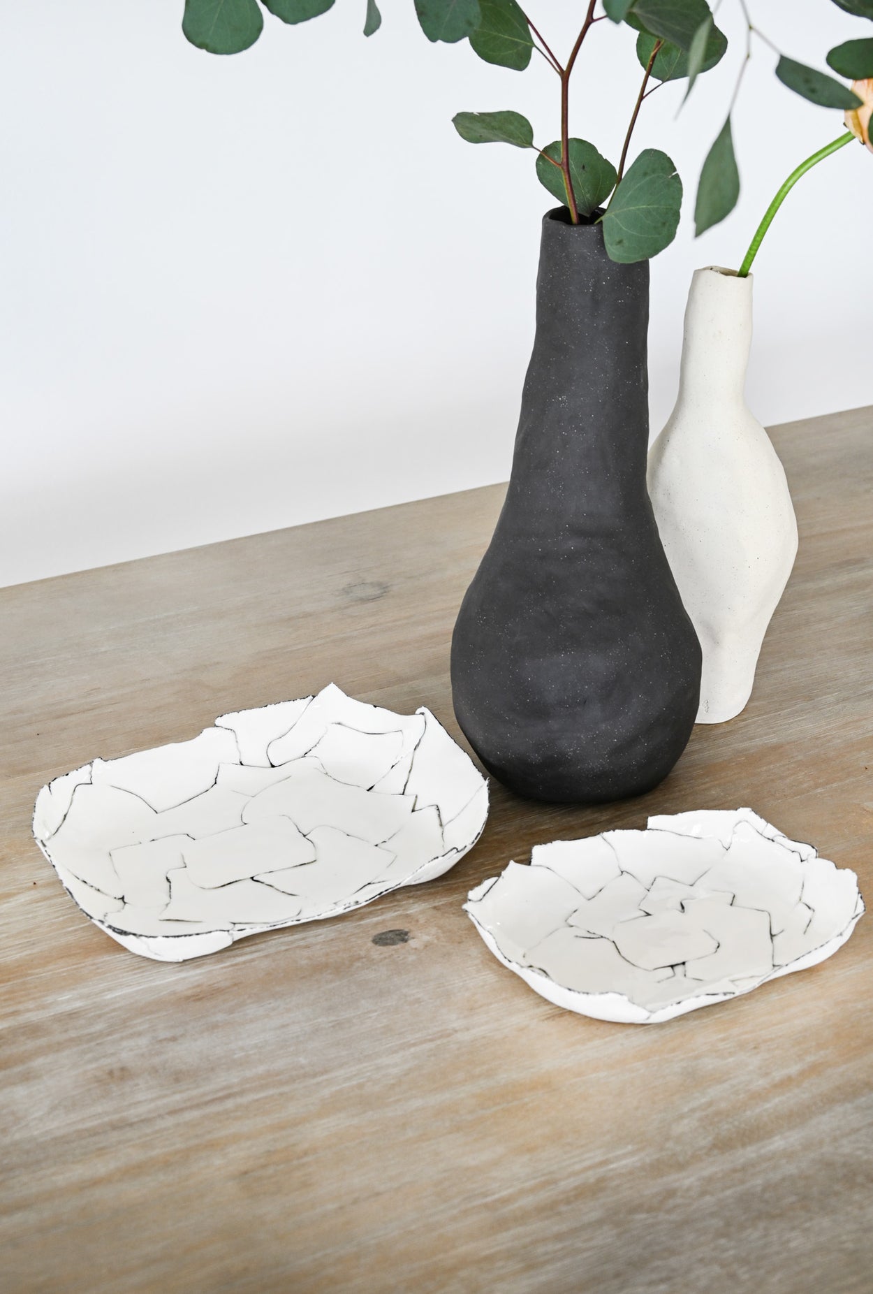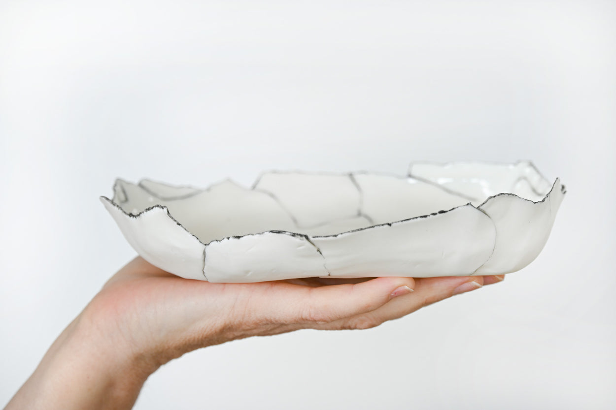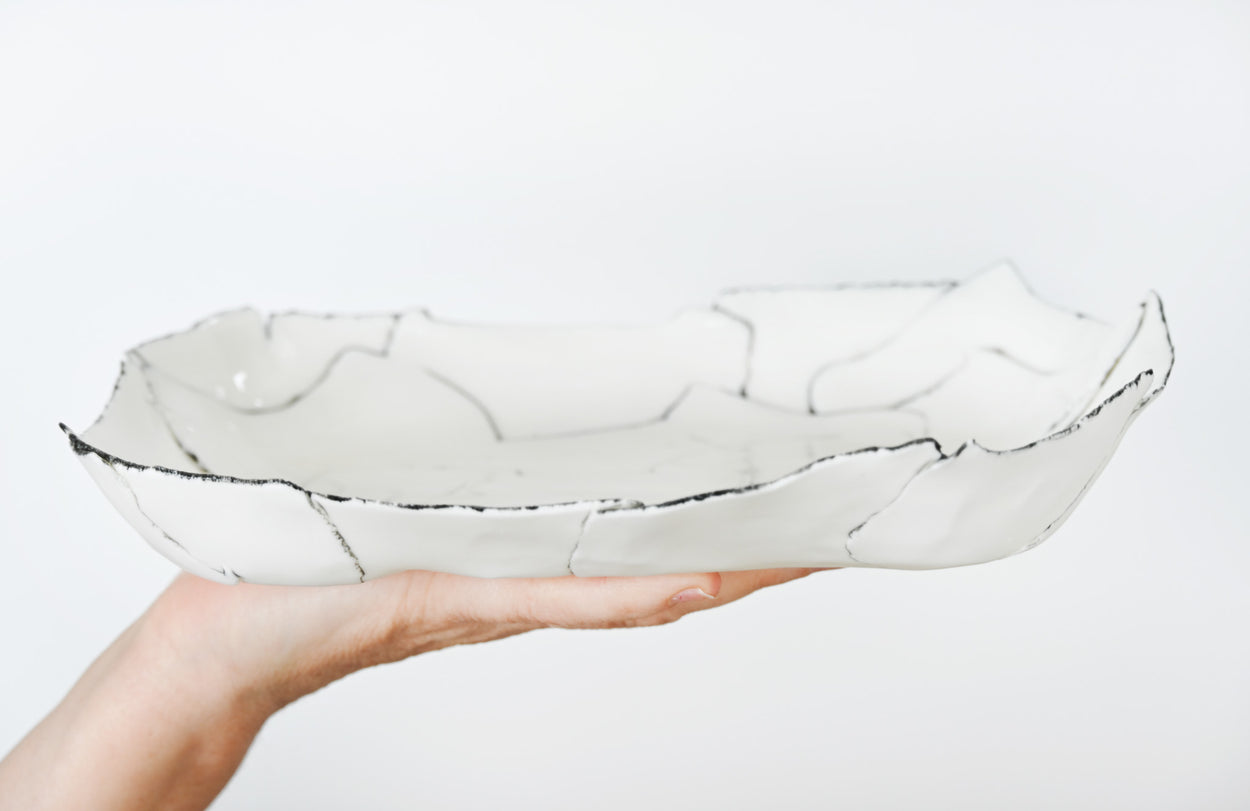 Chaque pièce est façonnée à la main, fruit d'un assemblage minutieux de languettes de porcelaine, qui lui confère sa forme et son caractère unique. La cuisson, parfois capricieuse, ajoute de légères variations. Les lignes blanches et noires se répondent, créant un équilibre subtil entre élégance et spontanéité.