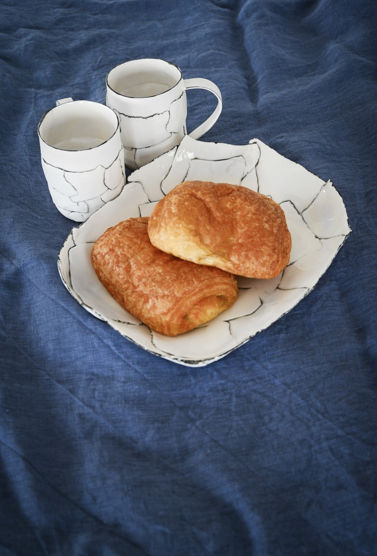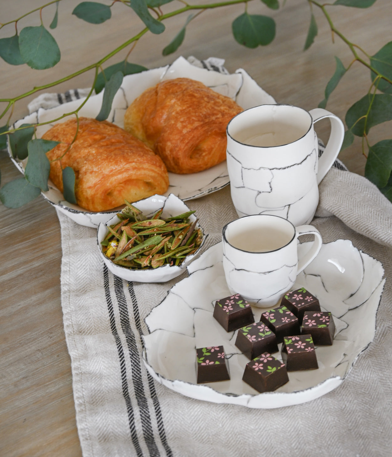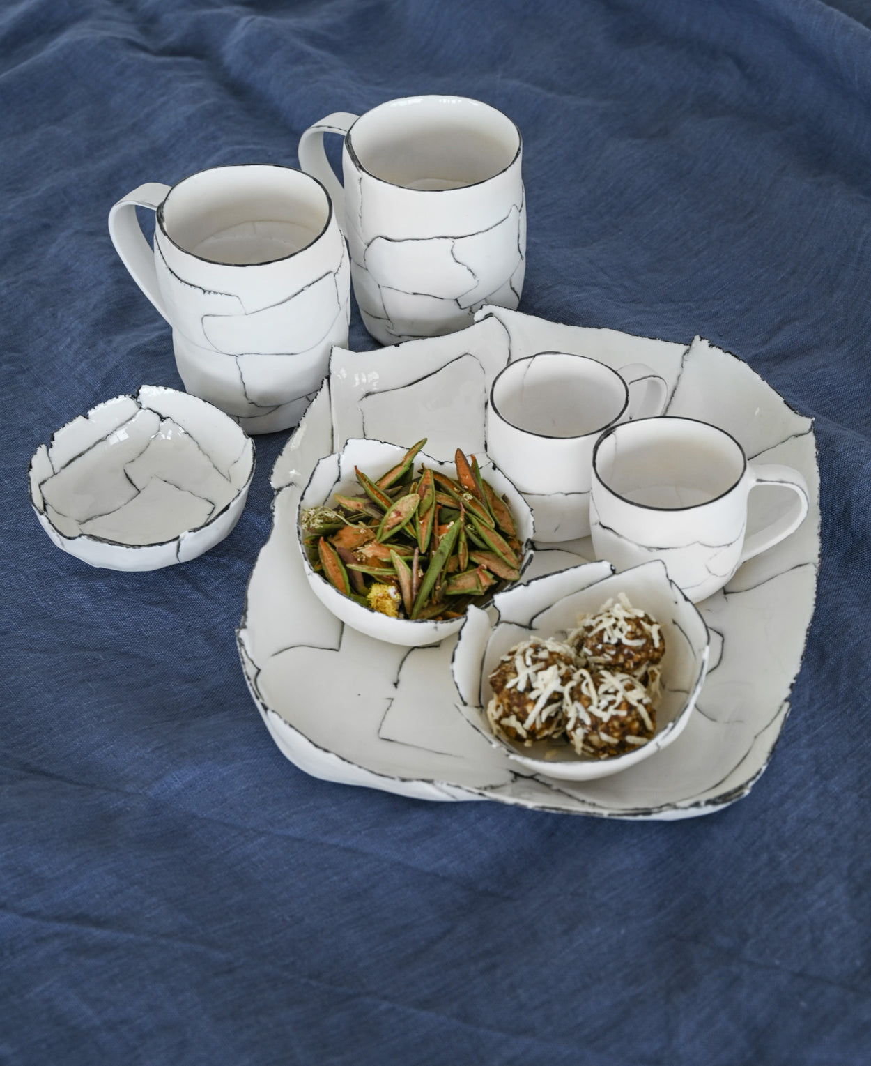 Chaque pièce est façonnée à la main, fruit d'un assemblage minutieux de languettes de porcelaine, qui lui confère sa forme et son caractère unique. La cuisson, parfois capricieuse, ajoute de légères variations. Les lignes blanches et noires se répondent, créant un équilibre subtil entre élégance et spontanéité.