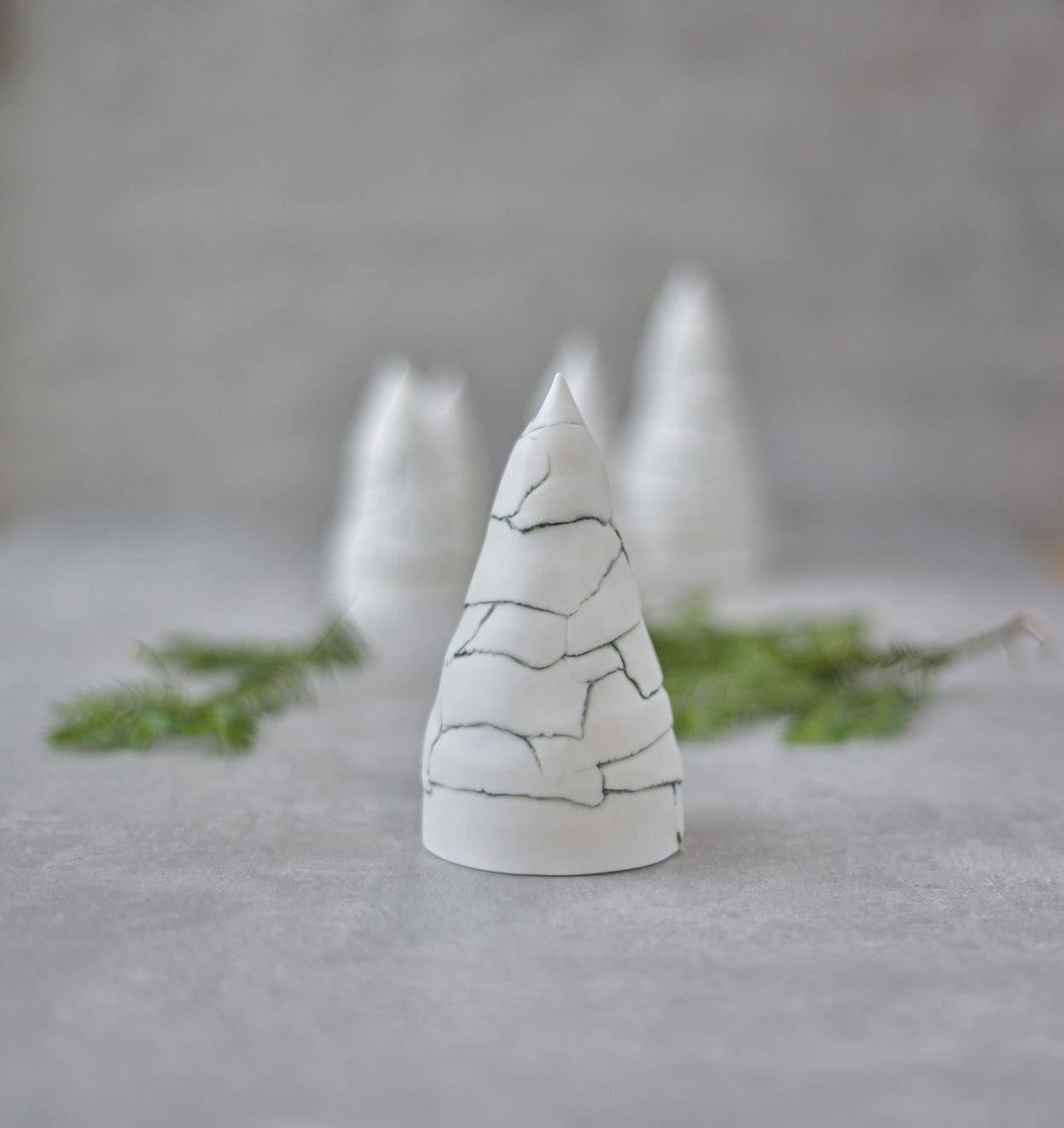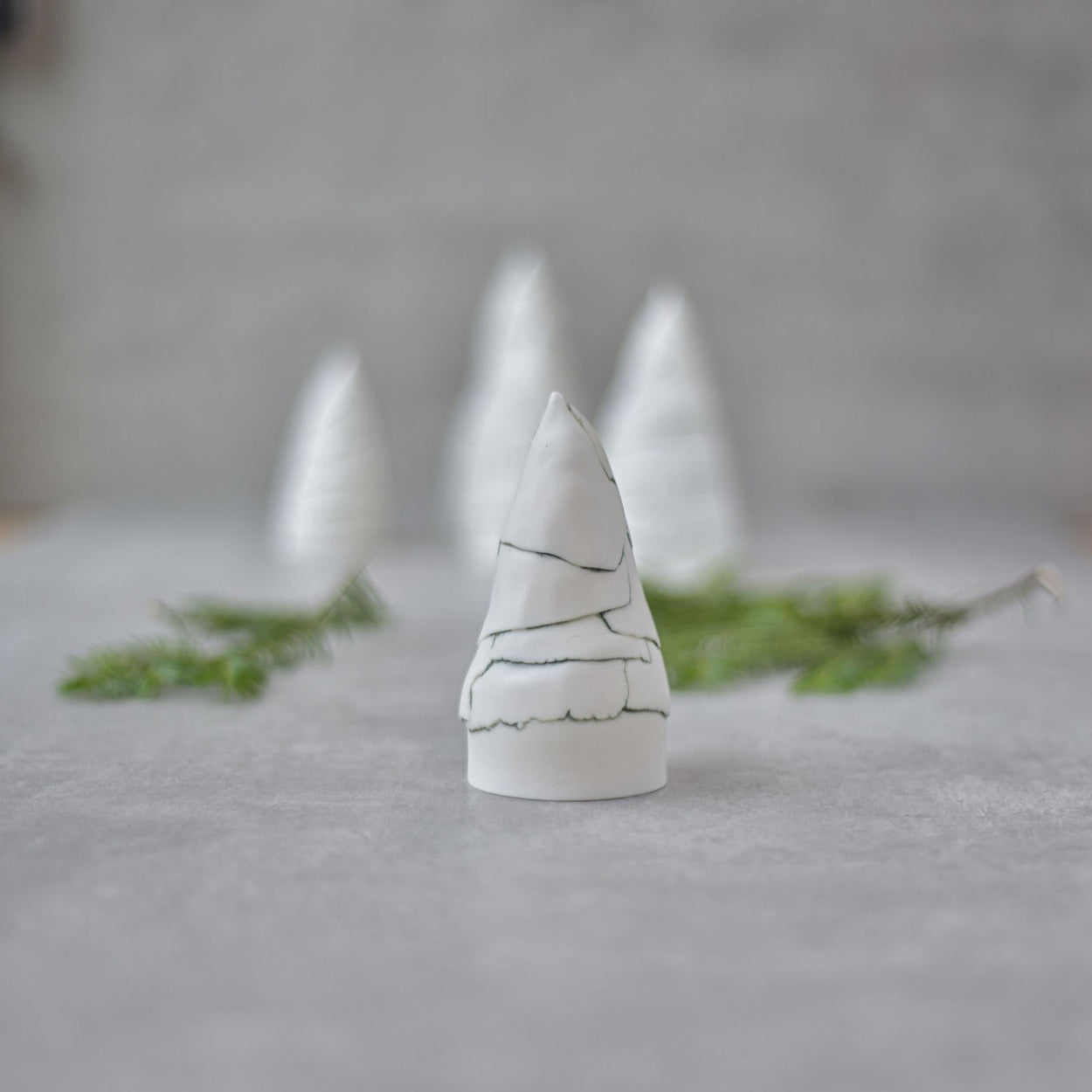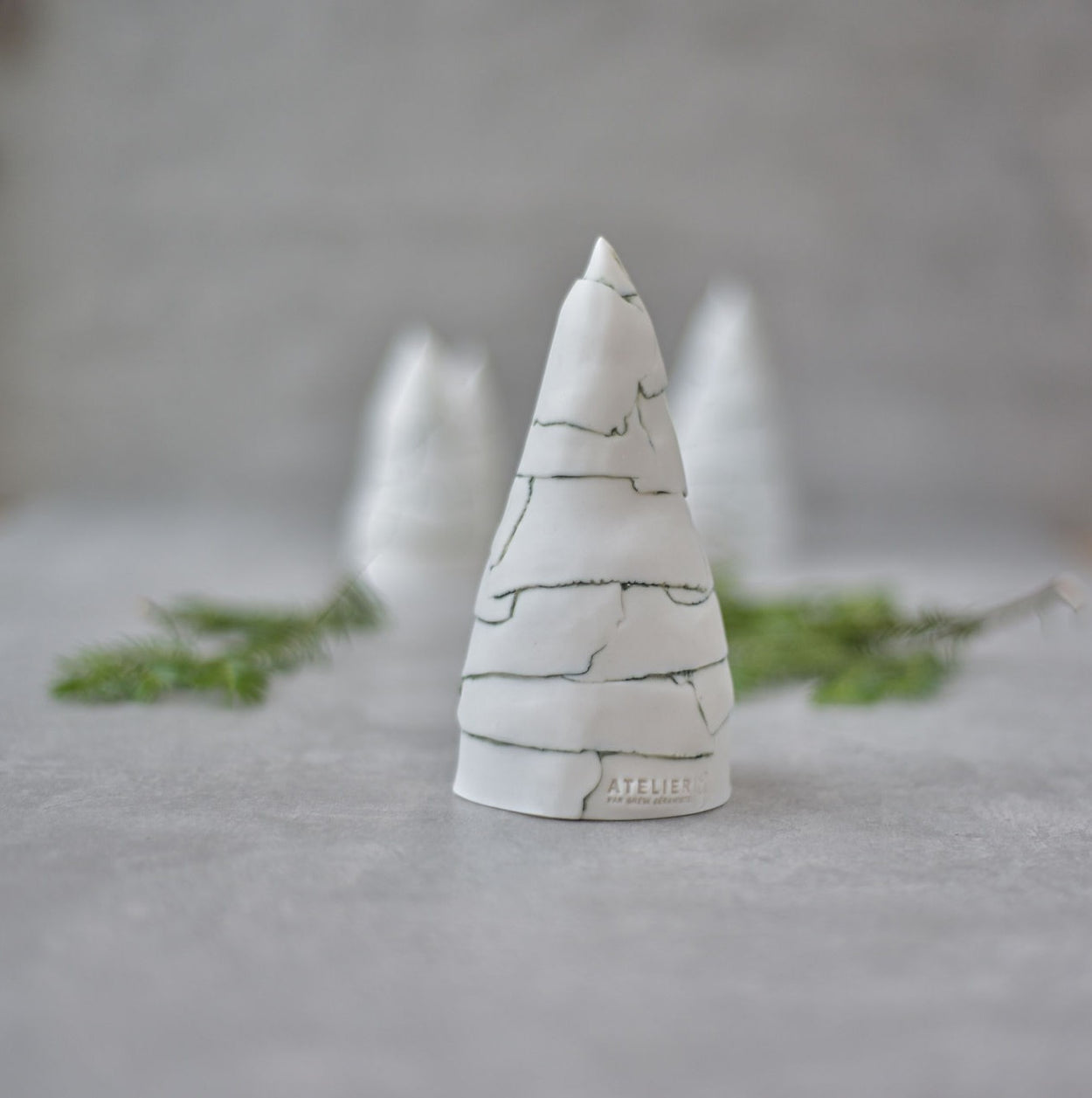 Façonnés à la main en porcelaine blanche, ces sapins évoquent la sérénité des forêts des Laurentides.