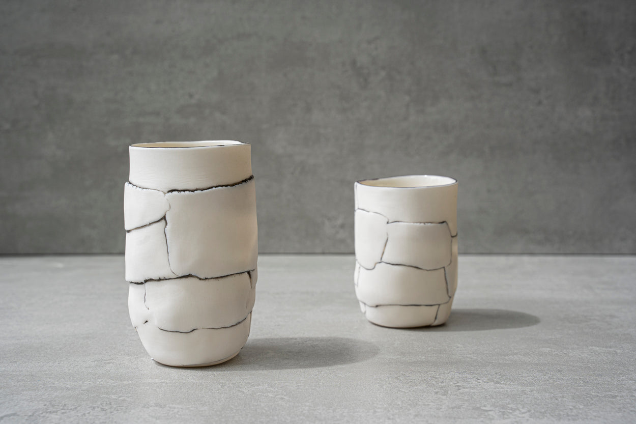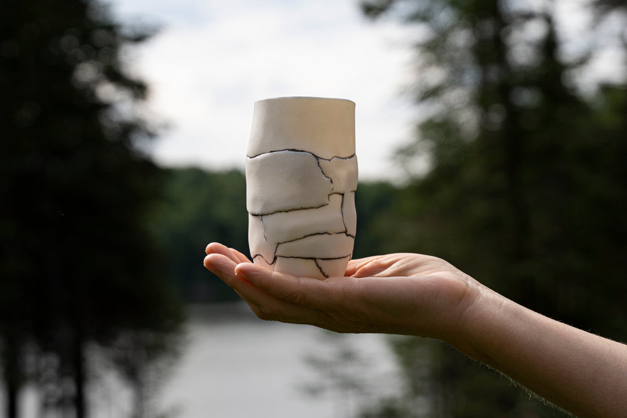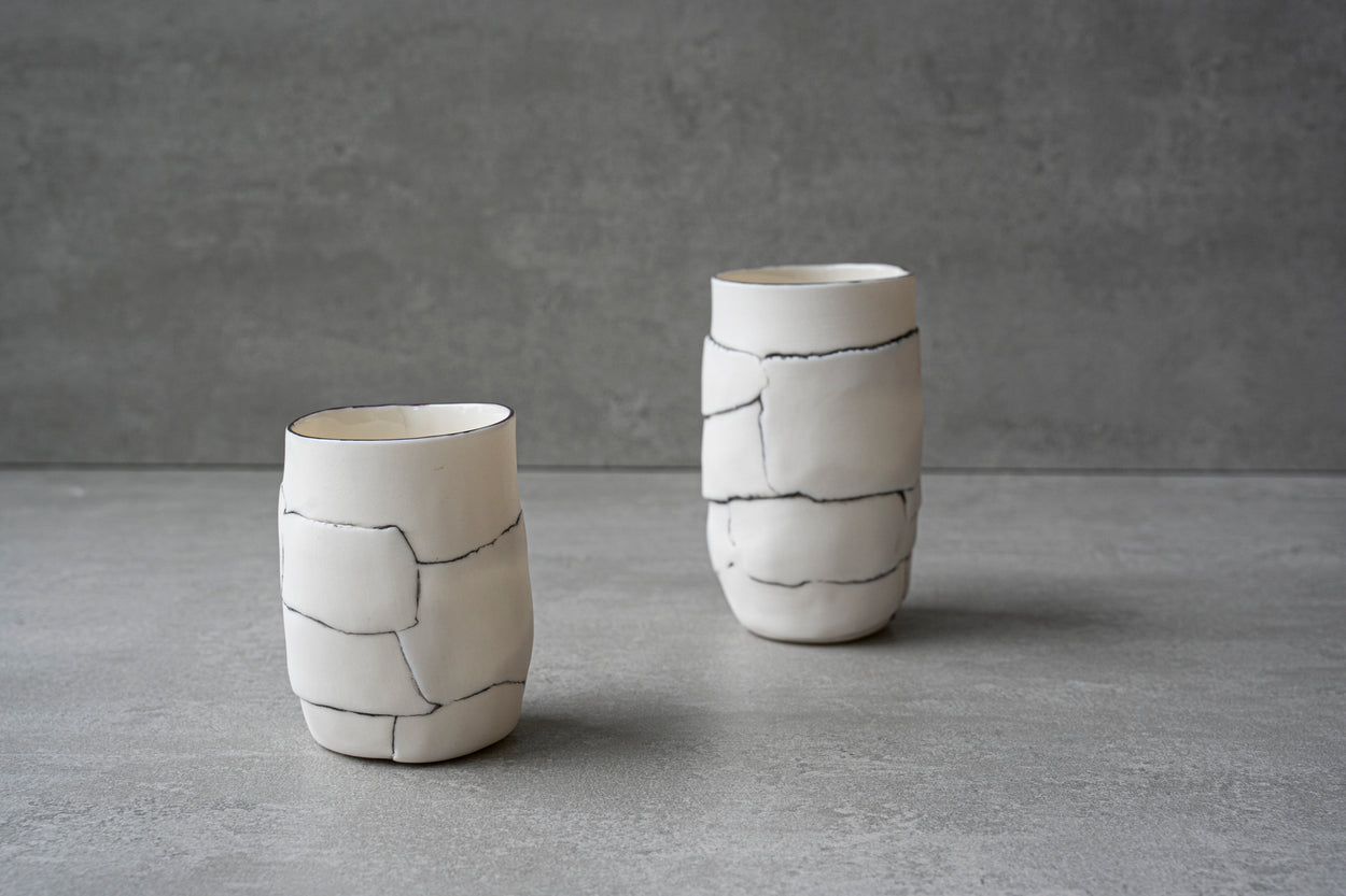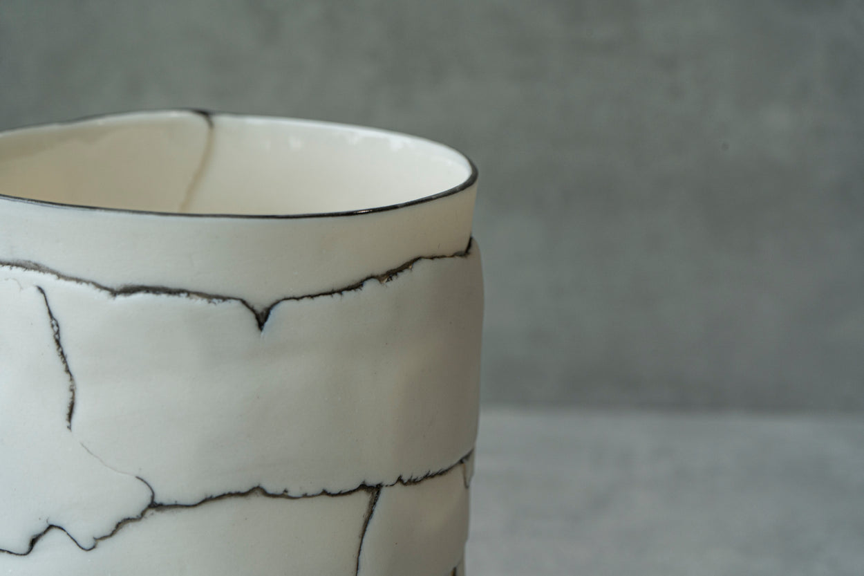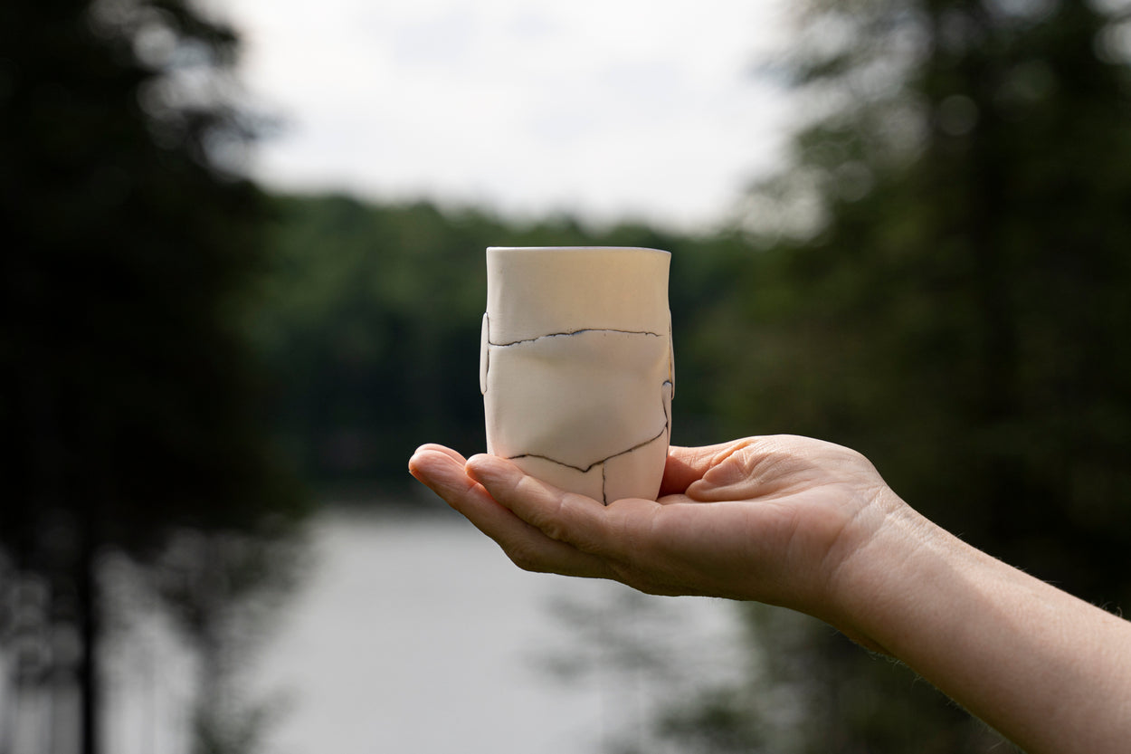Verre en porcelaine fine ultra blanche et translucide à la lumière. Émaillé à l'intérieur, poli à l'extérieur.